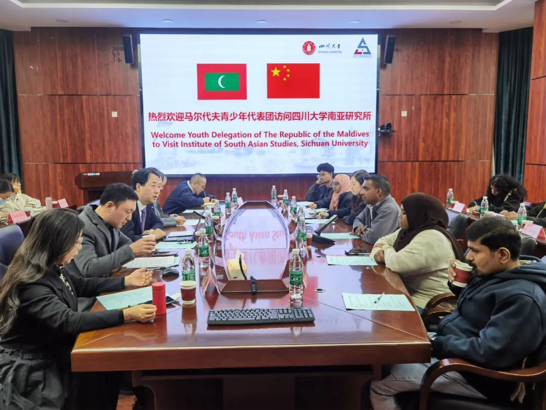 2025年11月18日下午,马尔代夫青少年代表团一行13人访问四川大学南亚研究所,与南亚所学者和部分南亚留学生在文科楼200室座谈,四川省国际友好交流中心交流主管蒋璇陪同来访。