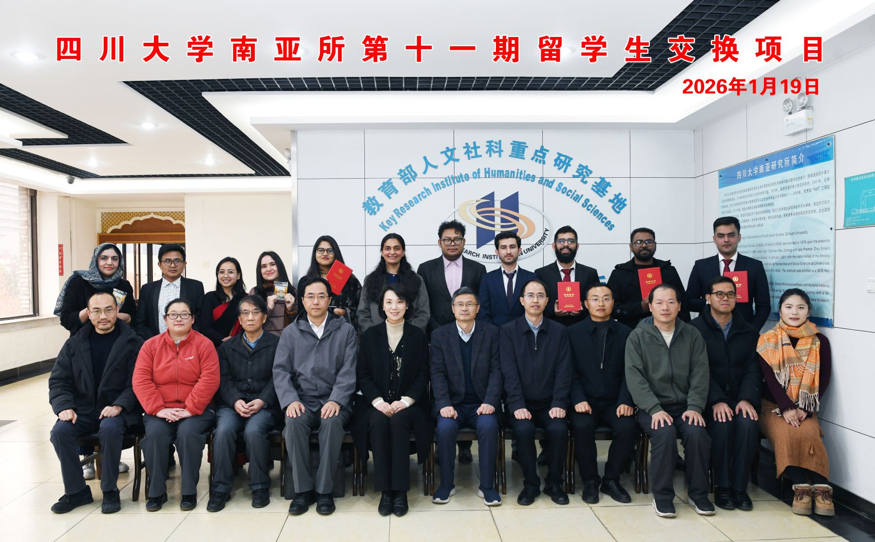 2026年1月19日,四川大学南亚研究所第十一期“一带一路”短期南亚留学生项目结业仪式在文科楼200举行。国际处领导、国际关系学院领导班子成员和南亚研究所教师代表,以及来自巴基斯坦、孟加拉国、印度、尼泊尔、阿富汗等国七所大学的11名硕士研究生出席了结业仪式。